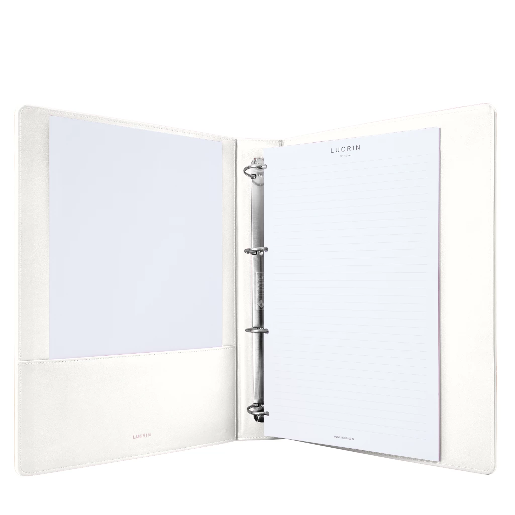 Upgrade your office style and organisation with this unique leather A4 office binder by LUCRIN Geneva. This exceptional ring binder boasts a sleek design, including a convenient flat pocket on the left side for storing extra documents with ease. The right side features 4 round silver-coloured rings, ensuring a secure hold for all your important papers. The luxury leather finish not only provides durability but also adds an element of sophistication to your workspace. Customise your A4 office binder by choosing the leather colour and type. Take customisation a step further by adding a monogram of your company logo or initials, adding a personal touch that sets your binder apart.