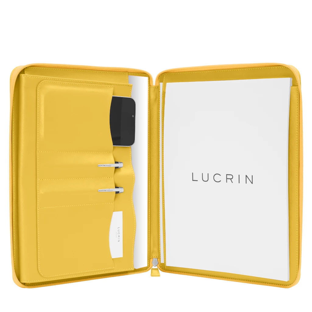 Organise your work in style with this leather organiser portfolio. Perfect for your outdoor meetings, this elegant portfolio organizer comes with designated compartments for your documents, tablet, pen and business cards. The slim design makes it the perfect companion for your overseas meetings, seminar and so on. Simply slip it into your bag or carry it in your hands to add some style to your look. Impress your clients and colleagues with this unqiue leather organiser portfolio. This organiser portfolio fits your iPad Pro 12.9”, Microsoft Surface 8 / X and other tablets up to 12.9”. Get a unique organizer portfolio by customising the leather colour and type from LUCRIN Geneva’s palette. Add an elegant engraving of your name or logo to stand out from the crowd.