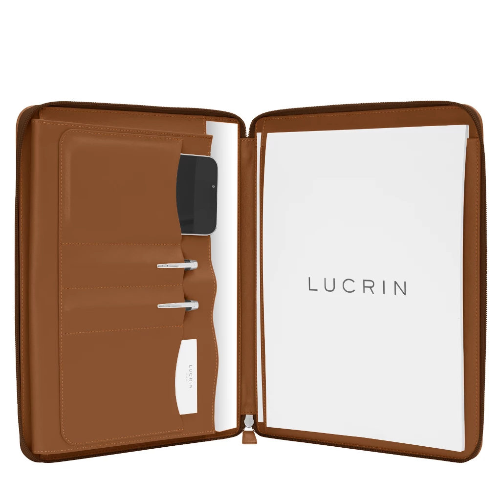 Organise your work in style with this leather organiser portfolio. Perfect for your outdoor meetings, this elegant portfolio organizer comes with designated compartments for your documents, tablet, pen and business cards. The slim design makes it the perfect companion for your overseas meetings, seminar and so on. Simply slip it into your bag or carry it in your hands to add some style to your look. Impress your clients and colleagues with this unqiue leather organiser portfolio. This organiser portfolio fits your iPad Pro 12.9”, Microsoft Surface 8 / X and other tablets up to 12.9”. Get a unique organizer portfolio by customising the leather colour and type from LUCRIN Geneva’s palette. Add an elegant engraving of your name or logo to stand out from the crowd.