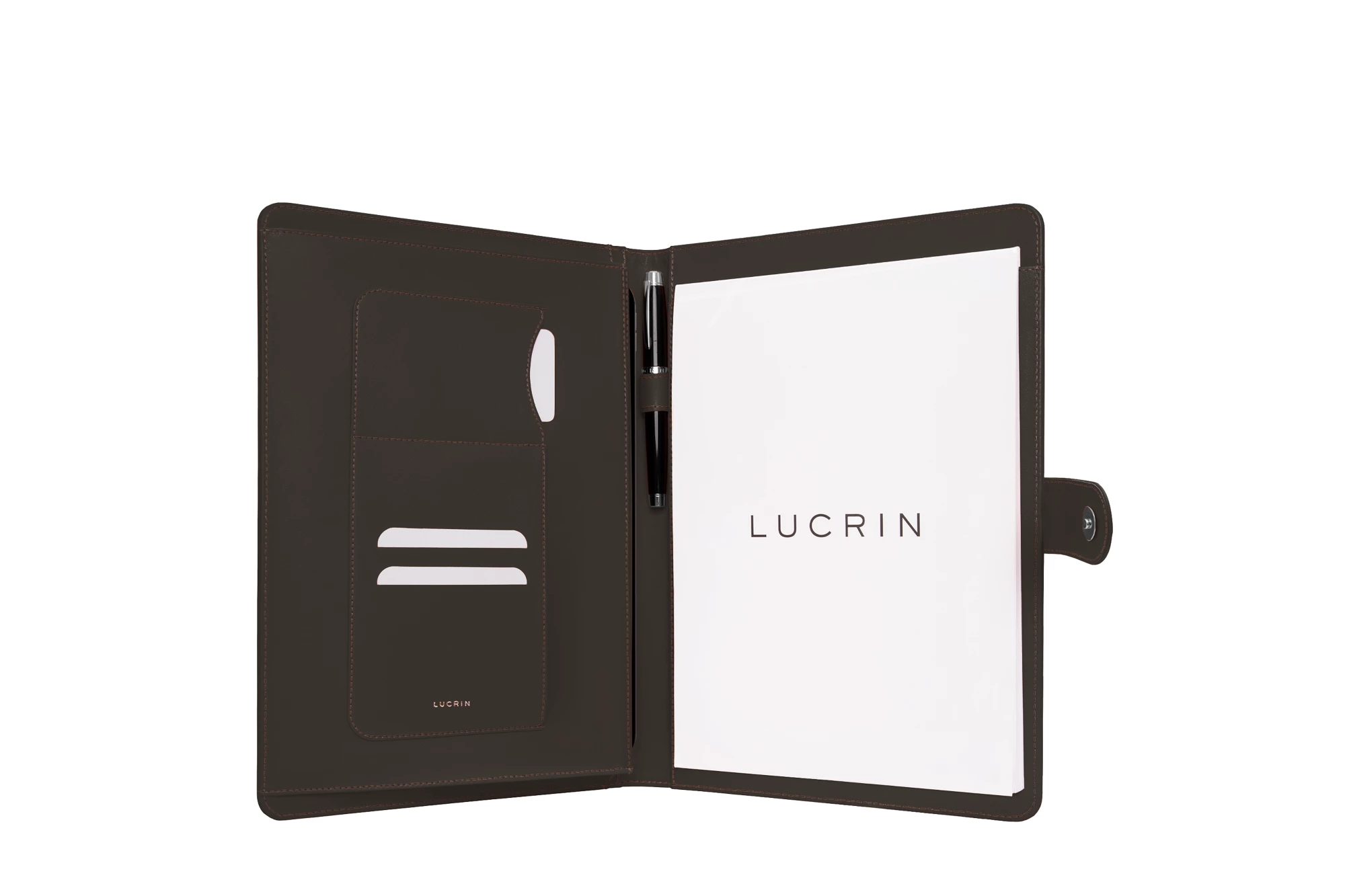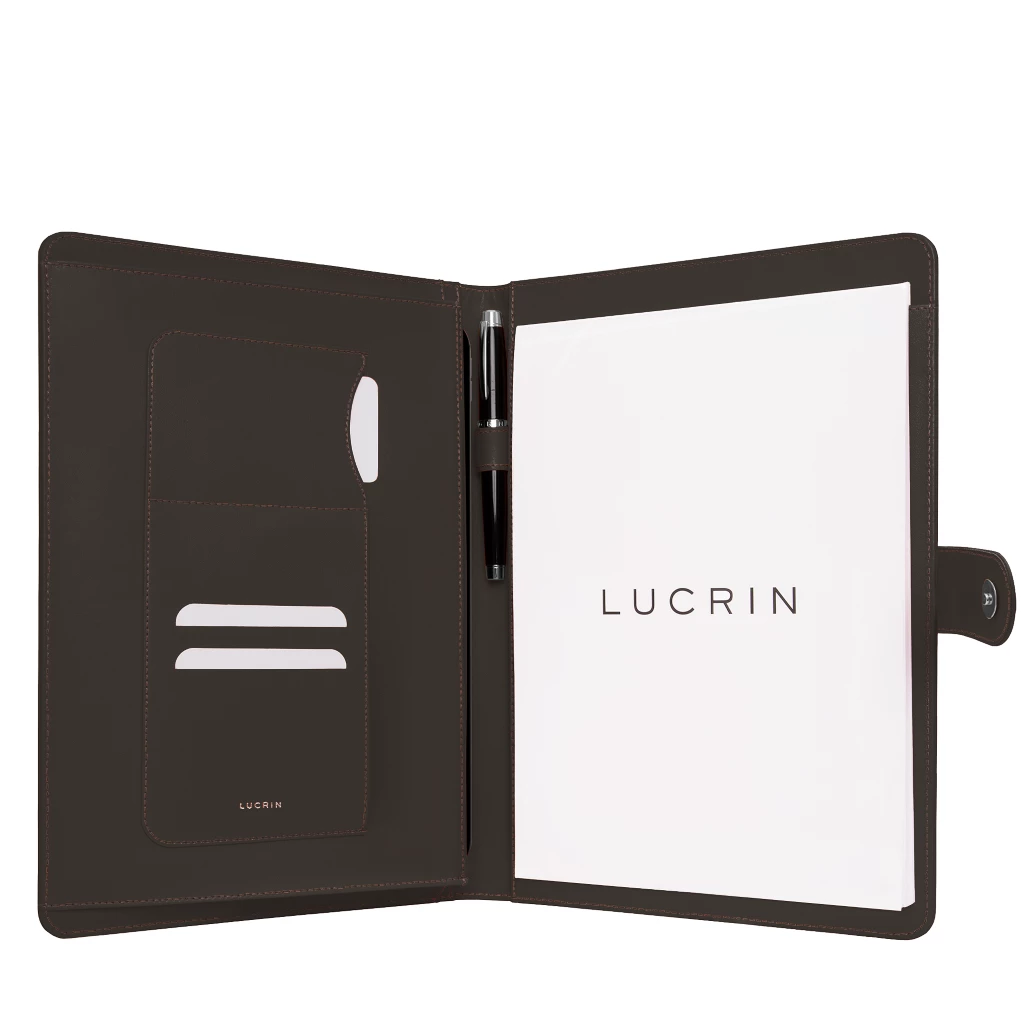 Handcrafted in exquisite leather, this A4 compendium embodies refined sophistication and functional design. A discreet magnetic tab closure secures a meticulously organised interior featuring a vertical document pocket, upper slip pocket, additional slip pocket, three card slots, a pen loop, and an A4 notepad slot. Designed for professionals who appreciate elegance in every detail, it includes an A4 notepad for effortless organisation and note-taking. Customisable in leather type, colour, stitching, and monogram for a truly personal touch.
