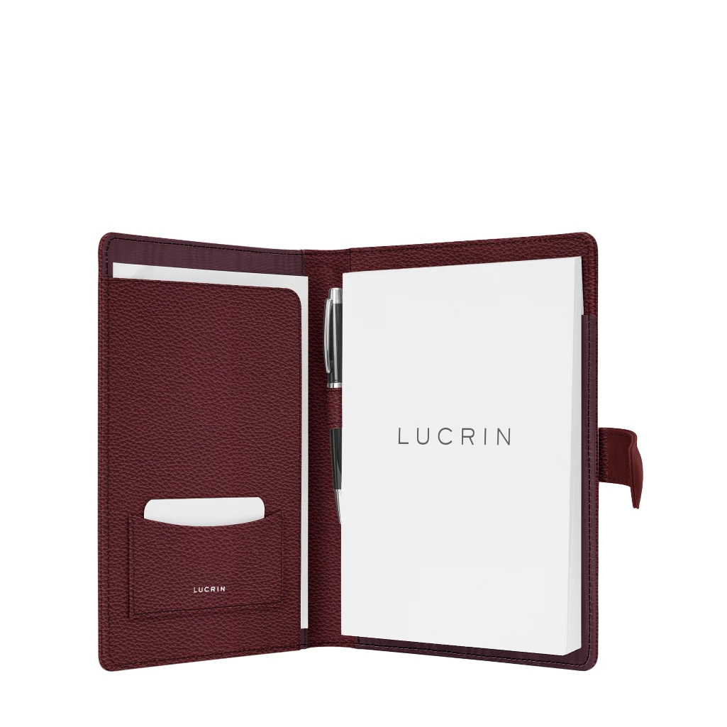 A5 Portfolio with loop Leather A5 portfolio with loop clasp. A flat pocket to the right and an added pocket for business cards. Pen loop. Ideal for business men, managers or professionals.