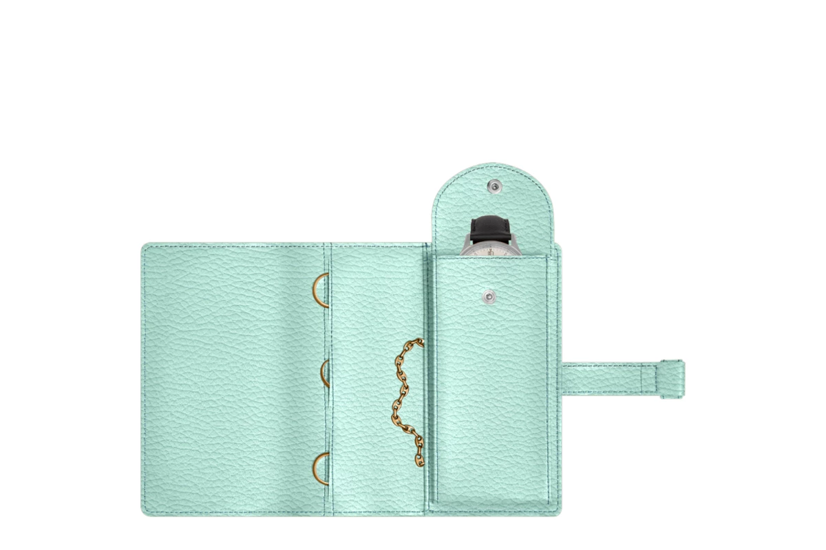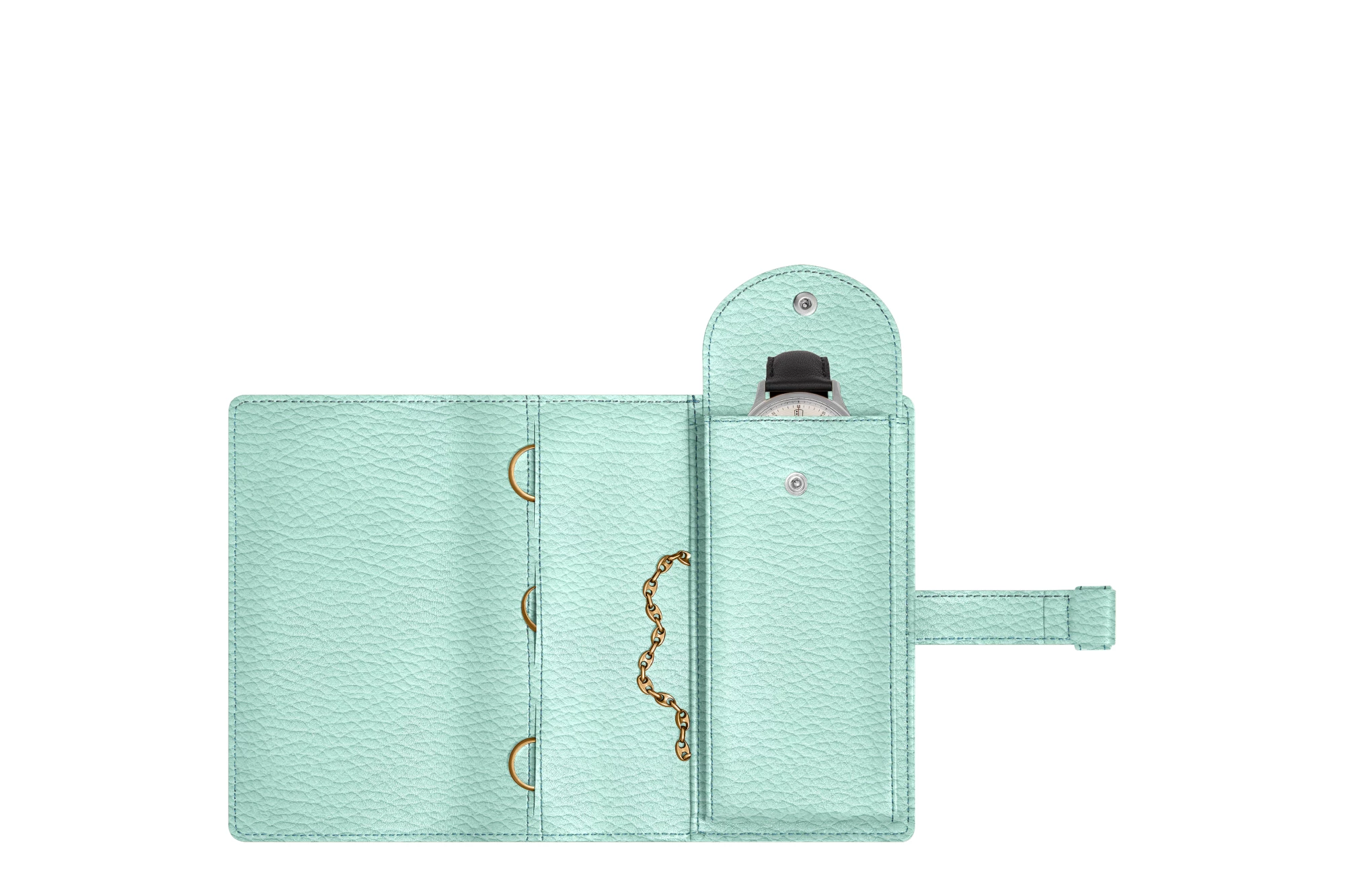 Watch and jewellery pouch. Pouch, all leather both outside and inside, ideal for jewellery. Leather loop fastening. On the right, a separate compartment for your watch. A flat pocket for bracelets and necklaces. Three pockets for rings.