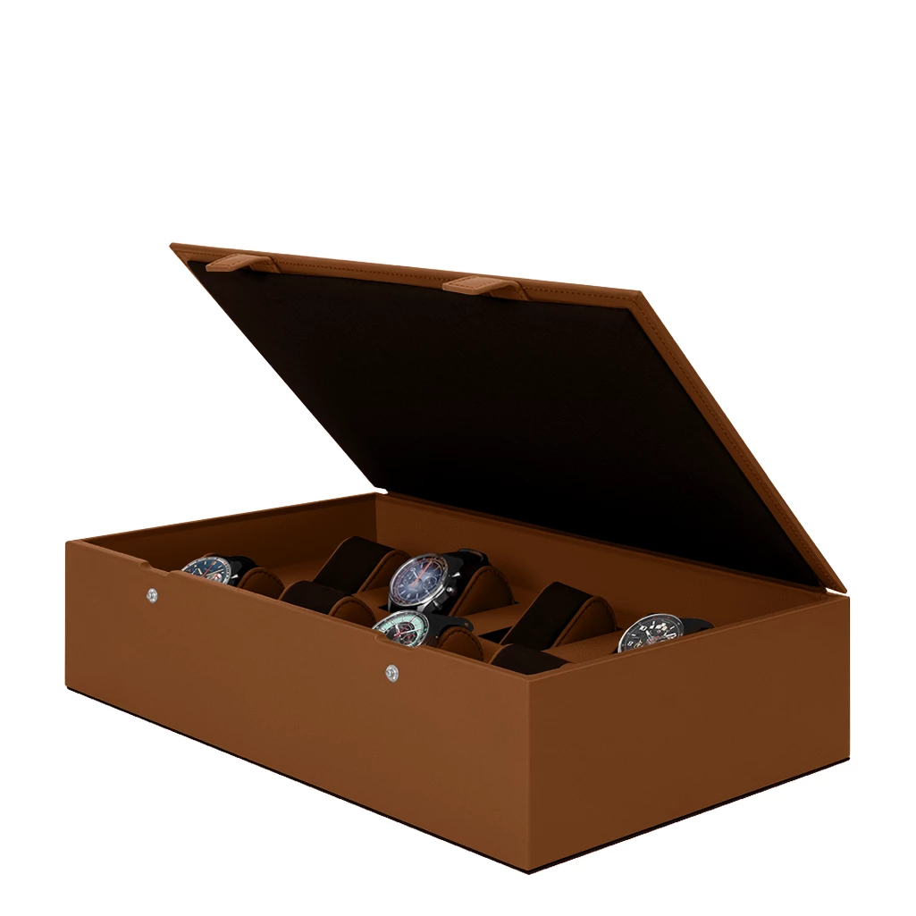 Discover the epitome of luxury with our meticulously crafted leather watch box, designed to house and protect up to eight of your most cherished timepieces. Encased in a stunning wooden base lined with premium leather, this watch box exudes timeless sophistication. The rich and sturdy wood offers exceptional durability, while the leather-sheathed exterior adds a touch of refined elegance. The interior and each compartment are cushioned with ultra-soft microfiber, ensuring your watches are completely comfortable and protected from scratches. For added security, the box includes individual watch cushions and compartments, providing an extra layer of protection. With its sleek design and high-quality materials, this watch box is not only a statement piece but also a practical solution for the discerning watch collector. Customisable with monograms and available in various colours and thread options, it truly caters to your style.