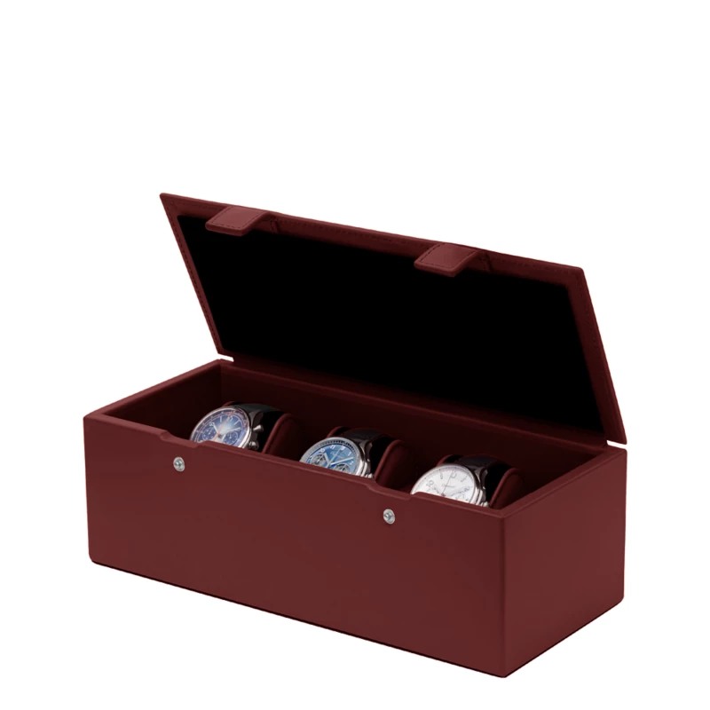 For watch connoisseurs who desire the highest level of protection for their collection, LUCRIN Geneva presents the Watch Box for 3 watches. This luxury watch storage box is crafted in a sturdy wooden base and sheathed in luxury leather. The interior is lined in premium microfibre and your three watches are held on three separate adjustable cushions. The double snap buttons hold everything safely inside the box. Customise your watch box with an engraving for added elegance!