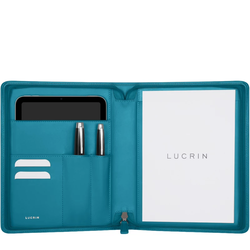 Discover this very practical compendium that can contain your A5-format notebook as well as your Hi-Tech essentials. This authentic leather portfolio folder case has a secure zip closure and can contain any A5 tablets up to the 11-inch format, along with your smartphone, earphones, pens, pencils and some business cards. This A5 Folio Case can be customised in a grand choice of leathers and colours, for example, with a unique engraving.