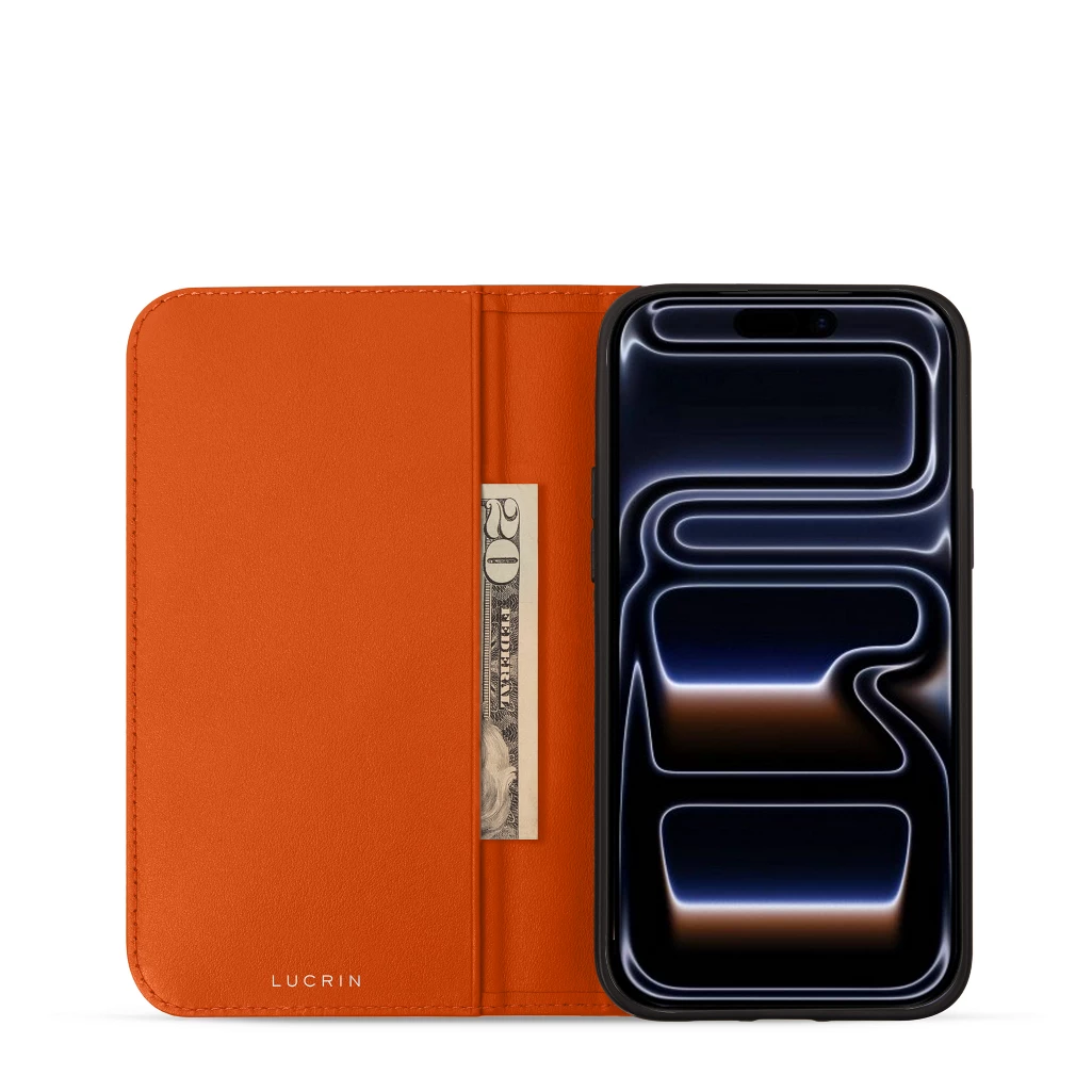Crafted for life in motion, this iPhone 17 Pro minimalist wallet combines Swiss precision with fluid functionality. The magnetic flap lets you take calls with the case closed, while a discreet side pocket keeps notes close at hand. A streamlined silhouette, thoughtfully designed for everyday use. A silicone bumper with raised edges cushions your phone from bumps and scratches. Hand-stitched to the leather cover, the bumper ensures a secure fit and prevents any detachment from the case over time. Slim by design, this leather wallet phone case protects without adding bulk — built to shield, designed to move with you. Compatible with MagSafe and QI wireless charging, the iPhone 17 Pro wallet case keeps up with your pace. Choose your leather, pick your colour, and add a discreet monogram. Personalise your iPhone 17 Pro minimalist wallet — and make it unmistakably yours.