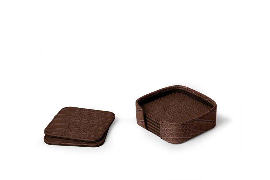 Set of 6 square coasters - Dark Brown - Crocodile style calfskin