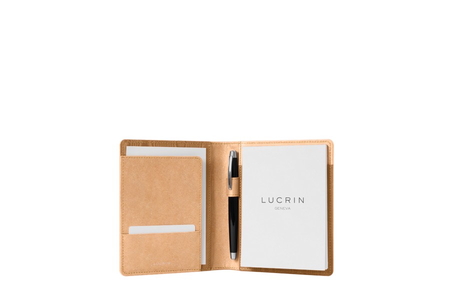 This office accessory is highly popular with professionals: the multipurpose A6 portfolio. Equipped with a curved flat pocket on the left - with a slot for business cards - and an A6 notepad on the right, this top quality leather portfolio also features a loop to hold your favorite pen. This A6 portfolio keeps everything you need for meetings and business trips always at hand. Please note that replacement A6 notepad refills are available for purchase on our website.