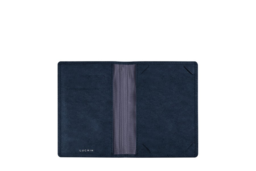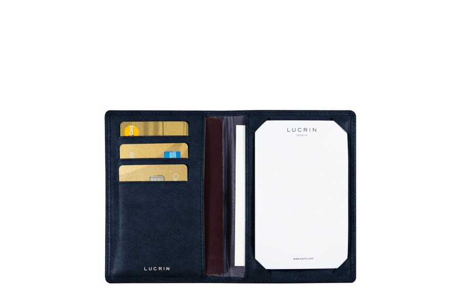 Pocket-sized note pad in full grain leather. Inside 2 pockets on the left, one for business cards and one large vertical passport format. On the right side, note pad and one large vertical pocket. Delivered with 10 white pages. Size open: 19,5 x 14 cm. Size closed: 9,5 x 14 cm