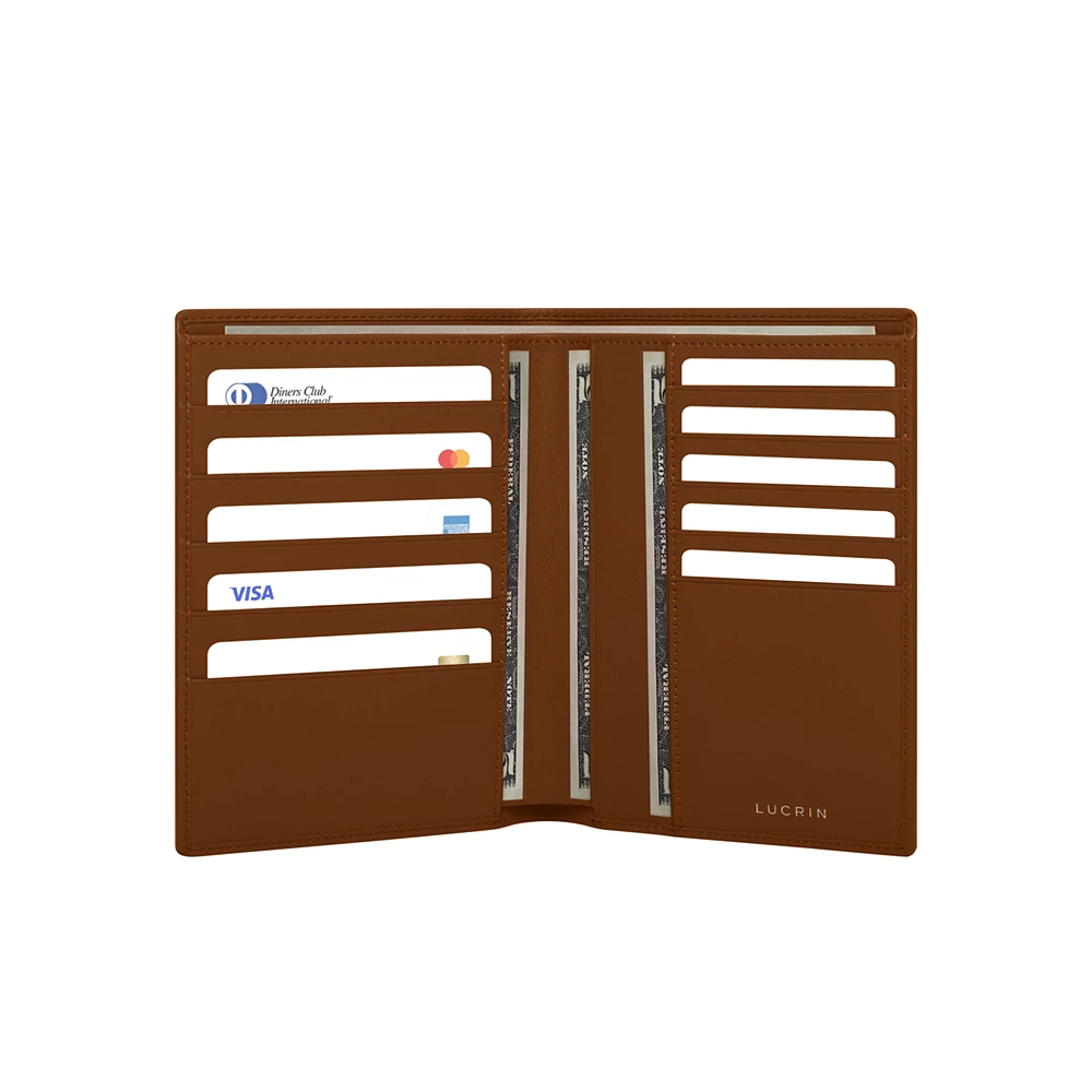 Wallet and cards holder Made of full grain leather. Wallet with 5 horizontal credit card pockets and 5 vertical credit card pockets, 3 internal flat pockets and 2 bill compartments.