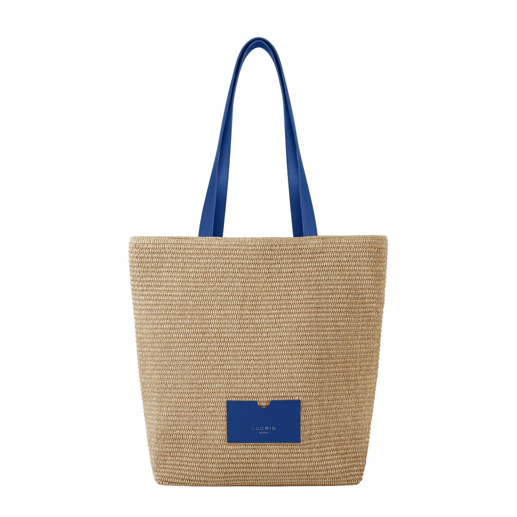 Raffia Summer Tote Bag with Gusset Royal Blue  - Smooth Leather