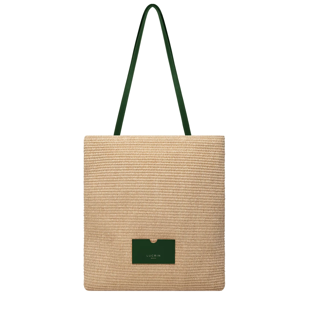 Raffia Summer Tote Bag Dark Green  - Smooth Leather