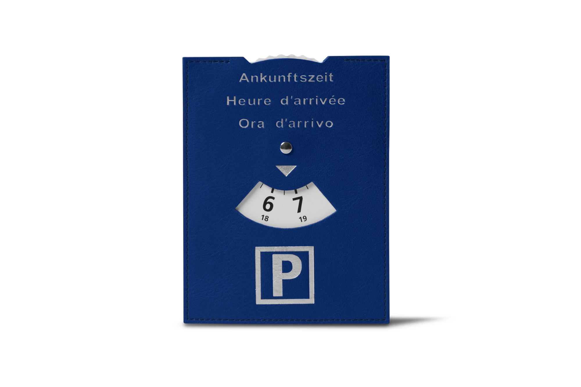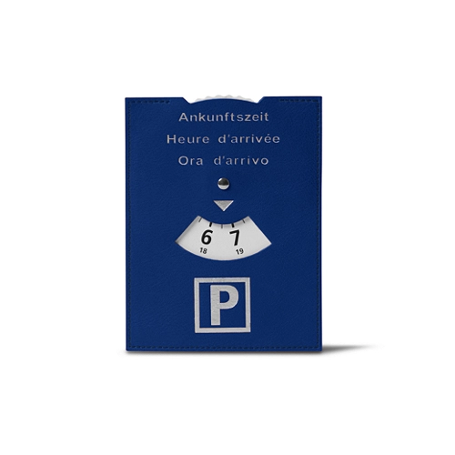 This parking disc is expertly covered in royal blue smooth leather of the finest quality and allows drivers to display their arrival time in a classy way. The engraved labels are printed in silver color, in 3 languages (German, French and Italian).