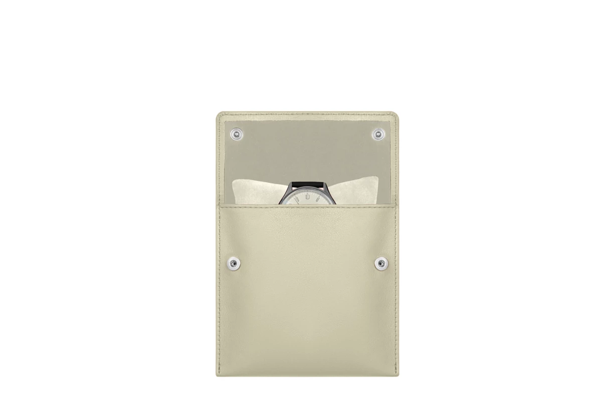 Used especially during travel, this soft watch holder for men or women is made in high-end authentic leather. Wrap your luxury watch around the microfiber lined cushion, slip it inside the square watch pouch and close it with the 2 snap buttons. Your watch will be protected in this elegant watch travel case in leather, which you may even customize with the engraving of your initials for instance.
