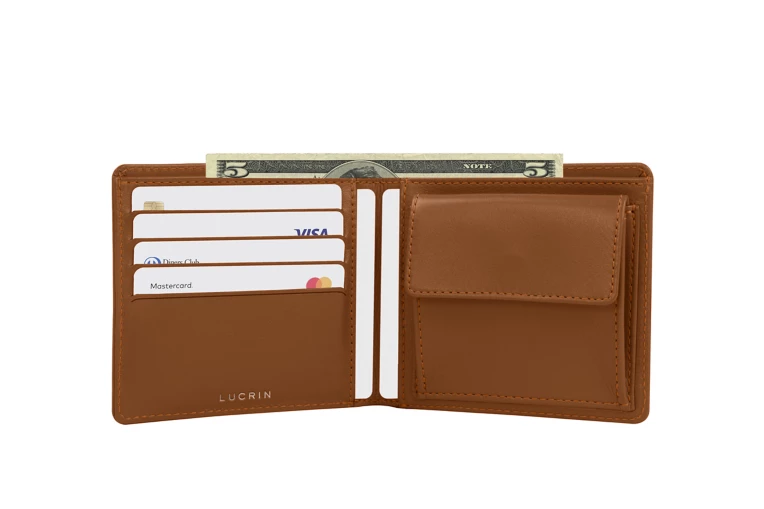 If you prefer to carry everything with you, choose this luxury leather wallet for men designed by the finest leather artisans at LUCRIN. The left side has 4 credit card slots with an additional flat pocket behind them to hold items such as receipts. The right side of the wallet has the same flat pocket, but the front features a compartment with a snap closure, ideal for storing change. This leather wallet also has a large compartment for bills and small papers.